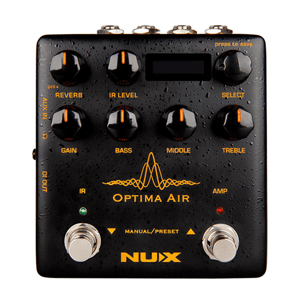 NUX Optima Air is a dual-switch acoustic guitar simulator with a preamp for acoustic and electric guitar players. It simulates the acoustic guitar profiles with the best-optimized sound depending on your guitar and pickup type.